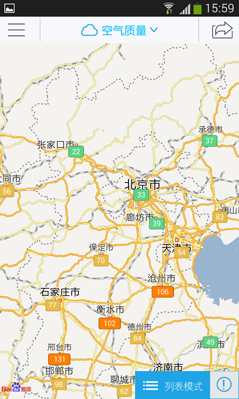 全国空气状况尽收眼底。随时查询190个城市近1000个空气质量监测站空气质量指数和污染物浓度